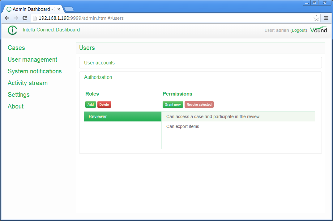 For simplicity, managing user accounts has been separated from managing roles and permissions. Both those features are accessible after clicking on User management in the left side menu in the Intella Connect Dashboard.