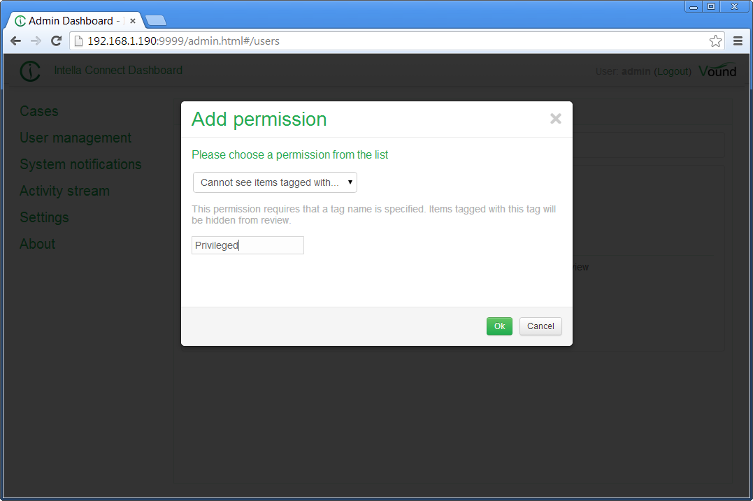 Some of the permissions can be added to a role just one (like case access), other can be assigned multiple times (like reducing access to tagged items). In the latter case, the user interface will change a bit and you will be asked to add additional data which is needed by the permission to fulfil its purpose. Again, for the example of limiting access to tagged items, you will be asked to supply the tag name so that Intella Connect knows which tagged items are considered off-limits for users with that role. The user interface should render some hints as you proceed, making the process fairly straightforward.