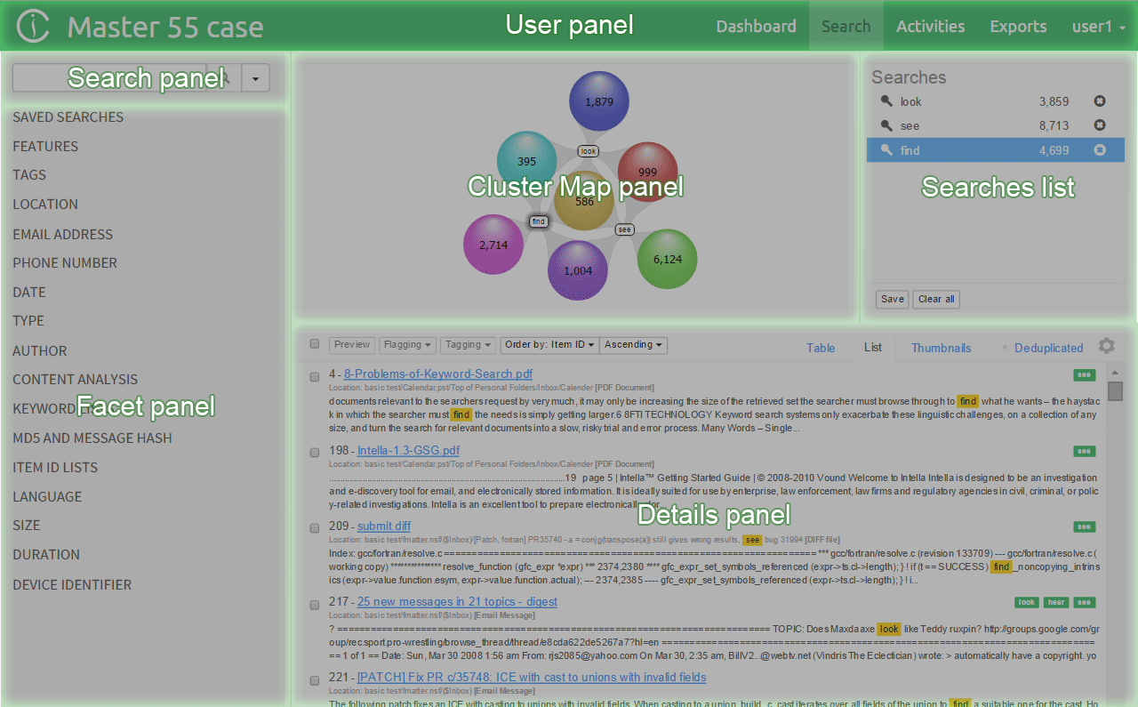 - Cluster Map panel - shows how search results are connected to