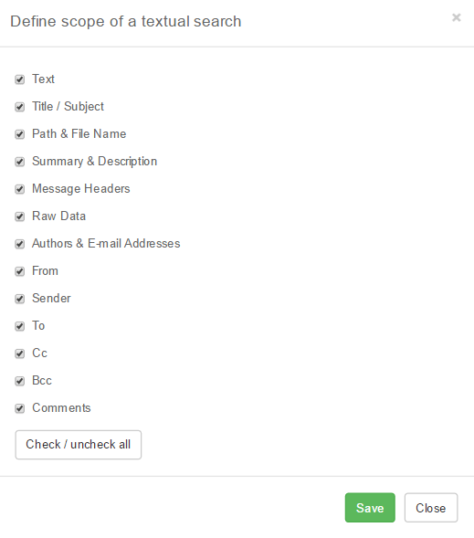Select the properties that you want to include in your search and deselect those you want to exclude. Your selected search options will be stored and used for future searches until the time you change them again.