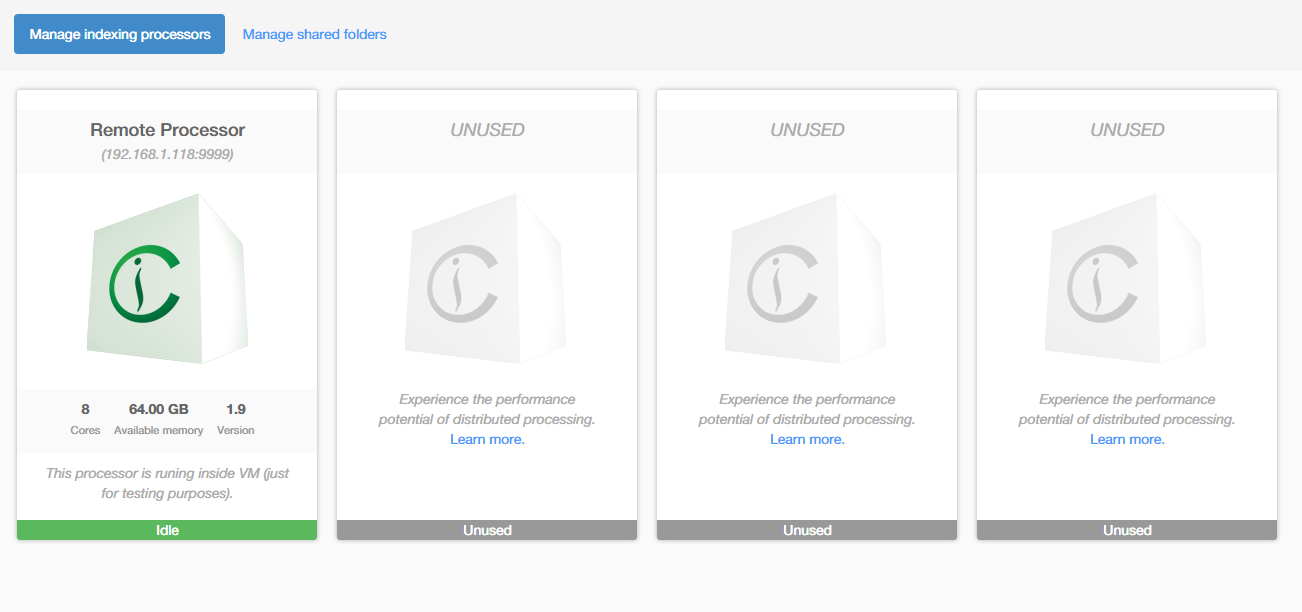 Intella Connect can make use of unlimited number of remote Intella Processors to perform remote indexing. For installing and setting up an Intella Processor please see Installing and starting Intella Connect/Processor section.