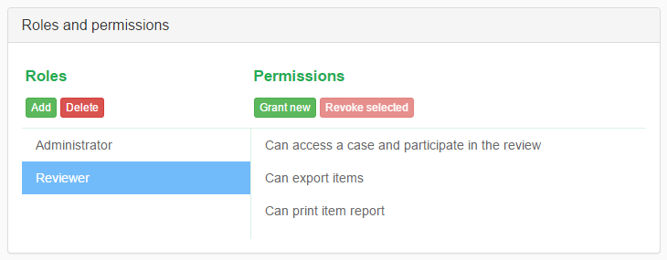 Note: In this section we only manage roles and their permissions. The last step will be to assign some roles to users in a context of given case, but this task is performed in theCasessharing panel.