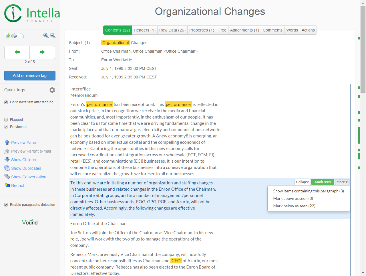 - Mark the paragraph as Seen, or back to Unseen. This grays out all occurrences of this paragraph in all items, facilitating the review of large amounts of long and overlapping documents such as email threads with lots of quoted paragraphs.
