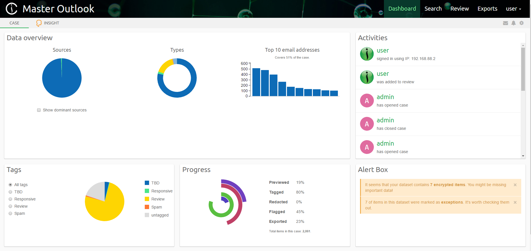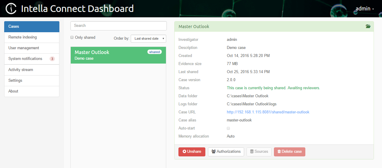 - The Intella Connect Dashboard will show the cases:
