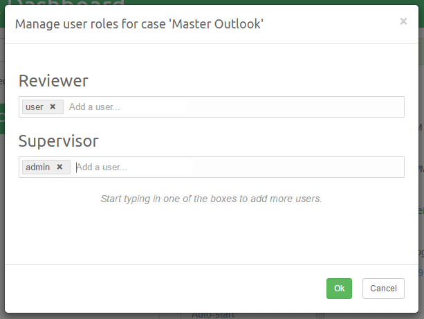 Assigning roles to users is quite straightforward. Click on the input box for a particular role (e.g. “Reviewer”)