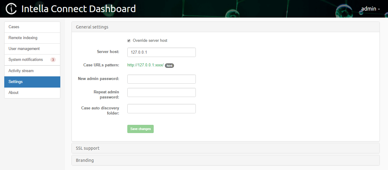 The fields New admin password and Repeat admin password are used to change the admin user’s password. Once these two fields are filled in, click on the Save changes button to change the password. After clicking the button, the notification Password changed successfully will be shown and you will be logged out from the Intella Connect Dashboard. To log back in, please use admin as user name together with the newly configured password.