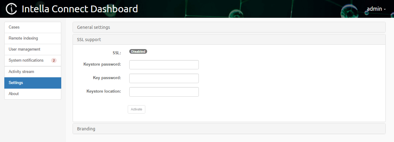 At this point you can come back to the Intella Connect Dashboard page and finish setting up SSL. The three mandatory fields that are listed there should be set as following:
