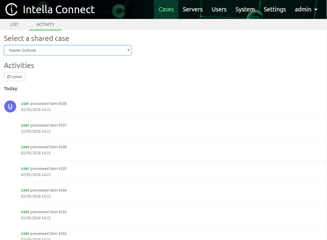 The Intella Connect Dashboard is the administrative part of Intella Connect and enables the administrator to share cases, define users, index cases remotely, view the activity stream from shared cases and modify the general settings of Intella Connect.