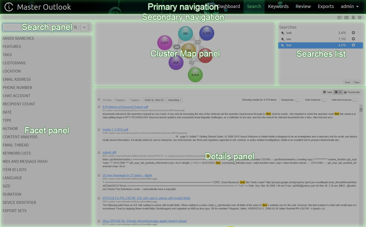 - Cluster Map panel - shows how search results are connected to parts of the query.