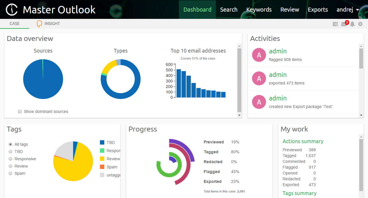 The Dashboard view is the default view that Intella Connect will display when the case is opened. It allows the user to see an overview of the case, particularly the kind of data which is contained in it, overall progress of the investigation as well as individual activities of other investigators.