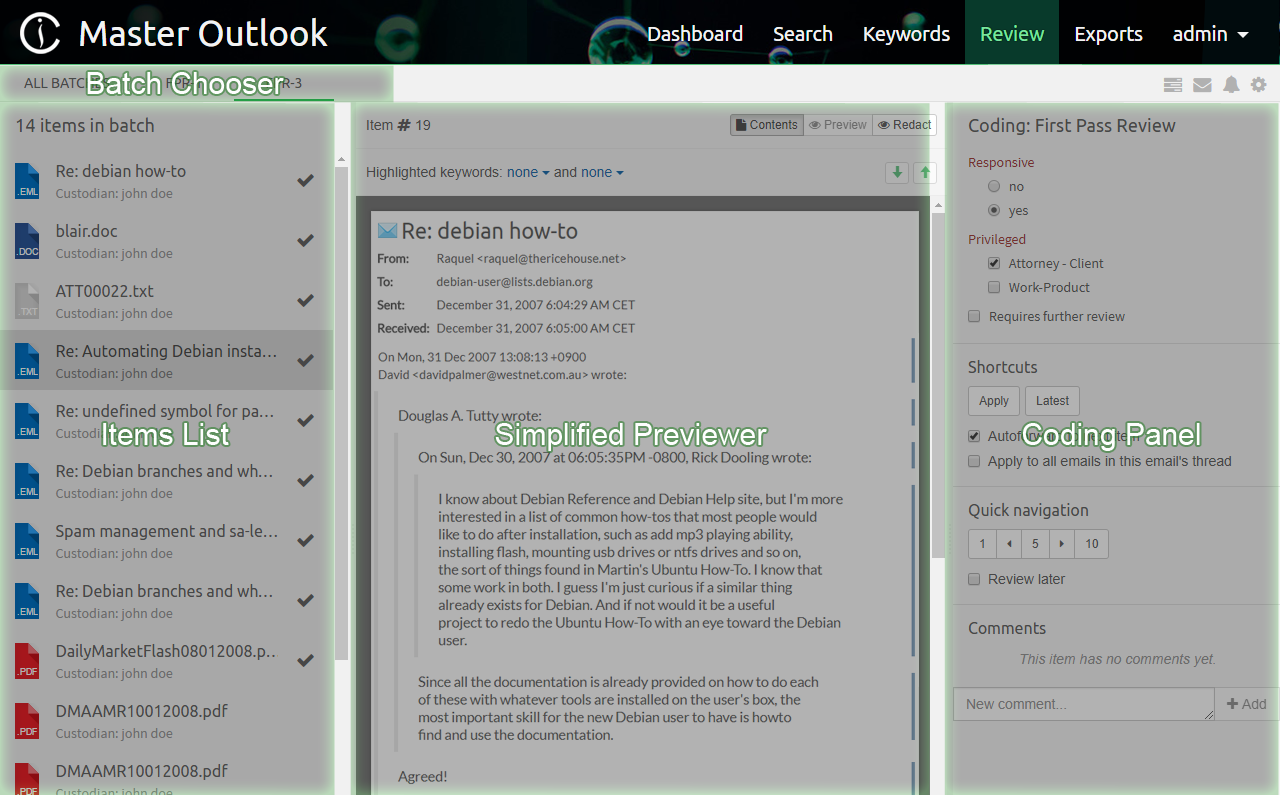 - Review view - allows for a simplified, cost effective review of items grouped into batches.