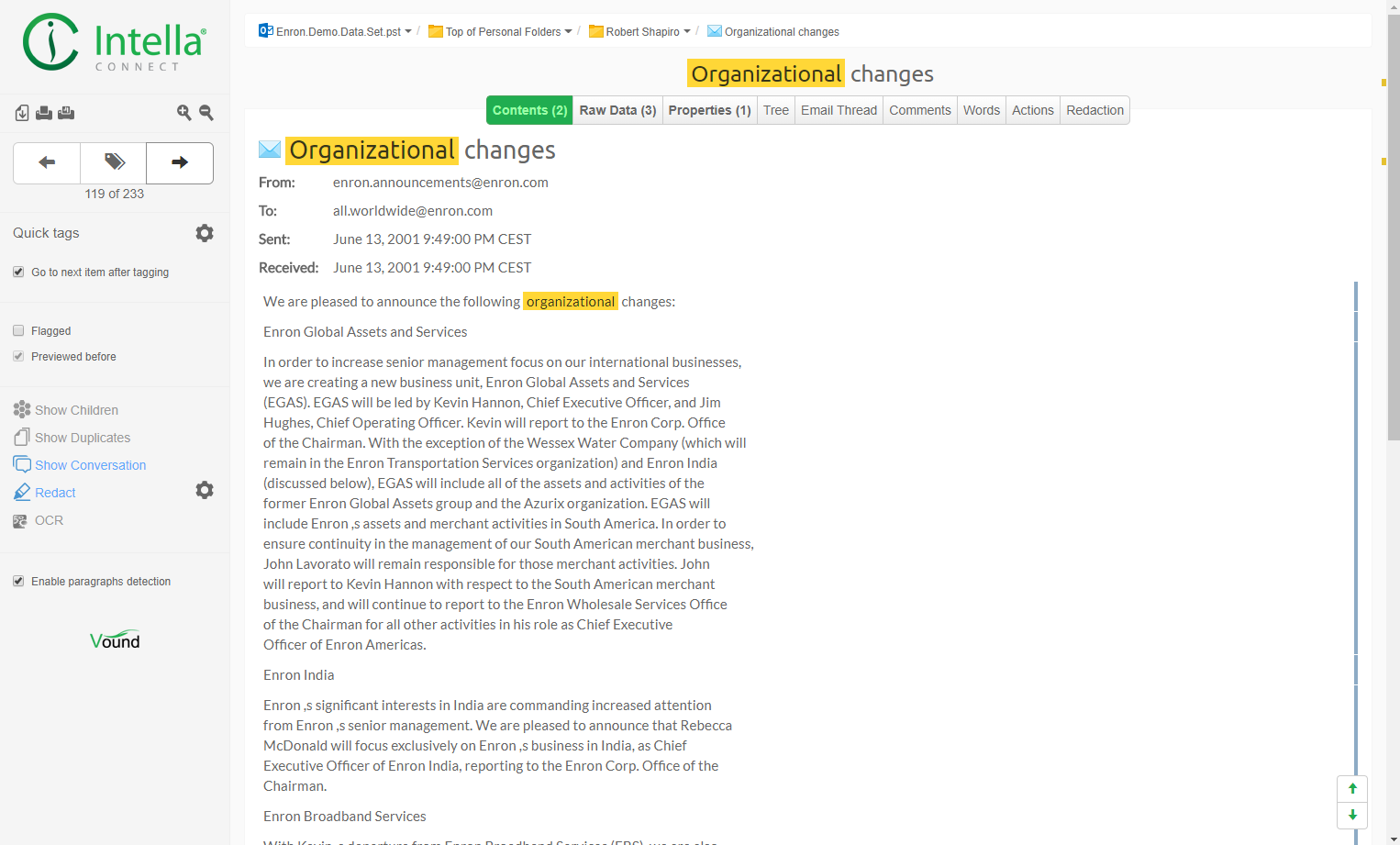 - Missing Email – indicates that the existence of an email could be derived from references found in other emails, though the email itself could not be found in the case.