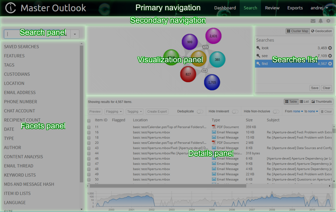 - Details panel - shows a list, table or thumbnail view of the results in a selected cluster. Optionally, timeline depicting distribution of items over time is shown at the bottom, see Timeline section.