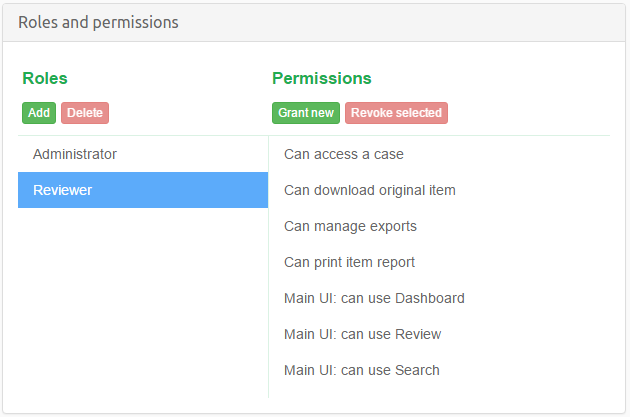 In this section we only manage roles and their permissions. The last step will be to assign some roles to users in a context of given case, but this task is performed in the Cases sharing panel.